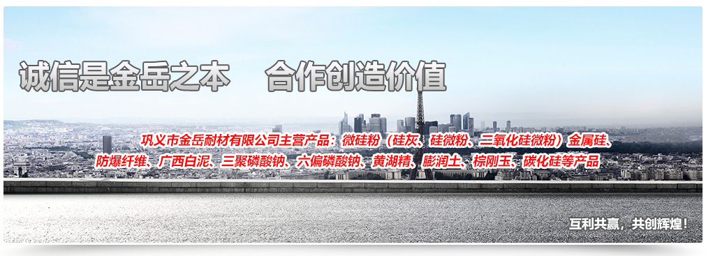 巩义市金岳耐材有限公司是中原地区经销耐材原料、化工原料、各种结合剂的一家独资企业。 目前,本公司以优惠的价格现货供应: 硅微粉、微硅粉、硅灰、二氧化硅微粉、 碳化硅、金属硅粉、建筑用硅粉、防爆纤维、三聚磷酸钠、 六偏磷酸钠、糊精、 广西白泥、 膨润土、钢纤维、 蓝晶石、 沥青、 a氧化铝粉、棕刚玉。